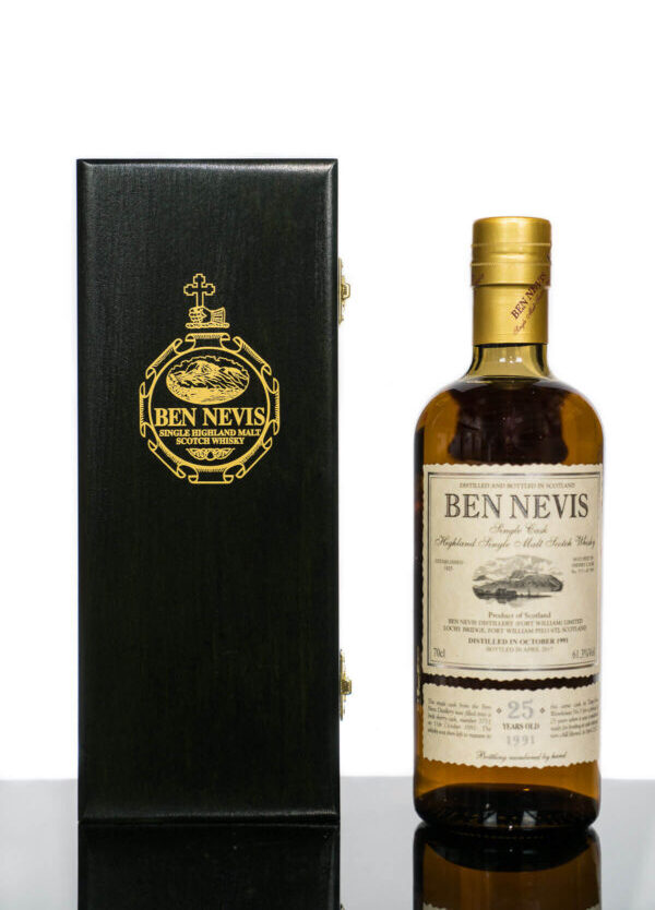 Ben Nevis 1991 25 Years Old Highland Single Malt Scotch Whisky (700ml) Volume: 700ml ABV: 61.3% Age: 25 Years Old Country: Scotland A single-cask, cask-strength edition of Ben Nevis single malt. Distilled just a year after Ben Nevis re-opened, this whisky was filled into a first fill Sherry cask and left in Duty Free Warehouse No.3 for 25 years. Our Tasting Notes Nose: Banoffee pie with blueberries and espresso. Palate: Chocolate coated raisins, honeycomb and smoke. Finish: Stewed red fruits, Christmas cake and leather.. For adults of legal drinking age. Please drink responsibly.