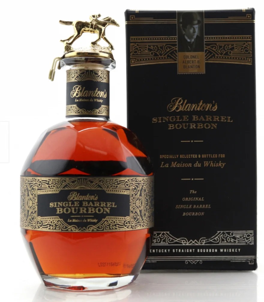 The Blanton’s brand was launched in 1984 under the guidance of the distillery’s master distiller Elmer T. Lee, as the first modern bourbon marketed as a single barrel bourbon. The original brand name was “Blanton’s Single Barrel Bourbon.” The barrels are dumped by hand without using machinery. There are eight different stopper designs, each with a different letter of the alphabet molded into it and topped with a figurine of a racehorse and jockey. When placed in order, spelling “B L A N T O N’ S”, the horse and jockey’s poses display eight different scenes of a horse race, from standing at the gate, to crossing the finish line with a win.