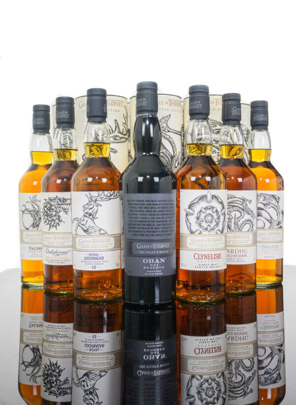 Games Of Thrones Single Malt FULL Collection (700ml) Volume: 700ml ABV: Various Age: No Age Statement Country: Scotland Get your hands on the full collection of Game of Thrones bottling’s. The Pack includes 8 bottles. -House Tyrell Clynelish Reserve Games Of Thrones Single Malt Collection (700ml) -Game of Thrones House Lannister Lagavulin 9 Years Old Single Malt Collection (700ml) -Game of Thrones Nights Watch Oban Bay Reserve Single Malt Collection (700ml) -House Targaryen Cardhu Gold Reserve Game of Thrones Single Malts Collection (700ml) -Game of Thrones House Greyjoy Talisker Select Reserve Single Malt Collection (700ml) -House Stark Dalwhinnie Winter’s Frost Games Of Thrones Single Malt Collection (700ml) -Game of Thrones House Baratheon Royal Lochnagar 12 Years Old Single Malt Collection (700ml) -House Tully The Singleton of Glendullan Game of Thrones Single Malt Collection (700ml) Please note that the collection is a 7 bottle collection with the Clynelish House Tyrell bottle added making it 8 bottles that you will be purchasing.. For adults of legal drinking age. Please drink responsibly.