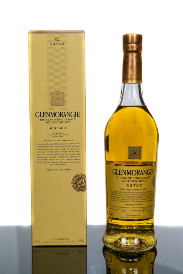 Glenmorangie Astar 2017 Release Highland Single Malt Scotch Whisky (700ml) Volume: 700 ml           ABV: 52.5%           Age: No Age Statement           Country: Scotland In 2008, on Glenmorangies ceaseless quest for perfection, they created Glenmorangie Astar (Scots Gaelic for “journey”), a single malt entirely matured in bespoke oak casks, which were designed to deliver perfection in the final spirit. Today, in its triumphant return, they renew their homage to the power of wood. The Astar’s extraordinary casks are hewn from hand-selected slow-grown oak trees from the Ozark mountains of Missouri, and meticulously crafted to exacting specifications, to ensure they impart their maximum flavour to the Glenmorangie delicate Highland spirit. Although the silken depths of its first release delighted connoisseurs, such casks are so rare that it has taken years to orchestrate its renaissance. In 2017, The Astar’s triumphant, limited-edition return brings a newfound richness and complexity to this smooth, creamy and long d single malt Official Tasting Notes Nose: Rich aromas of butterscotch and honey are balanced with bright, floral top notes, the freshness of mint, freshly squeezed lemons and a delightful burst of coconut. Taste: Smooth and creamy on the palate, as sumptuously sweet crème-brûlée emerges with tropical fruits, apricots and vanilla custard, hazelnuts in soft buttery fudge, then clove, toasted oak and a hint of cooling menthol. Finish: Honey and almond mingle with coconut ice and aniseed for an enduring smoothness at the finish.  . For adults of legal drinking age. Please drink responsibly.