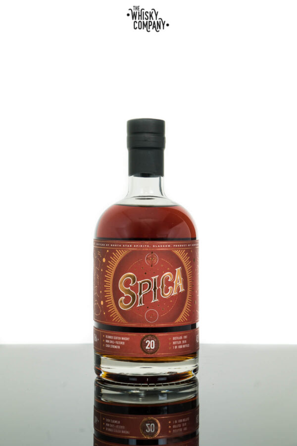Spica 20 Years Old Blended Scotch Malt Whisky (North Star) (700ml) Volume: 700ml           ABV: 45.2%           Age: 20 Years Old       Country: Scotland            Chill-Filtered?: Non chill-filtered Spica facts: Part of the constellation VIRGO, 16th brightest star in the sky, 250 light years from Earth, SPICA comes from the latin phrase ‘Ear of Wheat’, VIRGO is associated with the Greek goddess of the harvest ‘Ceres’. This is a limited edition blended Scotch whisky, aged 20 years in European and American oak barrels. Only 1000 bottles available worldwide. Distilled in 1997 and bottled in 2018. Our Tasting Notes Nose: Treacle toffee, fresh fruit salad, chocolate coated raisins. Taste: Dried dark fruits, quality dark chocolate, balanced sweetness and wonderful oak. Finish: Toffee, black pepper and stick date pudding sauce.  . For adults of legal drinking age. Please drink responsibly.